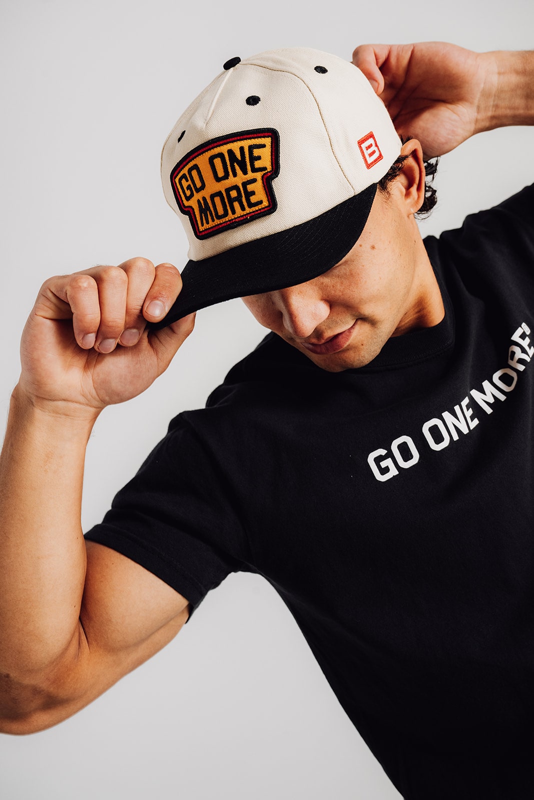 The cream crown and black bill frame a thick-stitched GO ONE MORE™ patch that stands out. This hat blends lifestyle comfort with the mindset of pushing one more rep, one more mile, one more day.